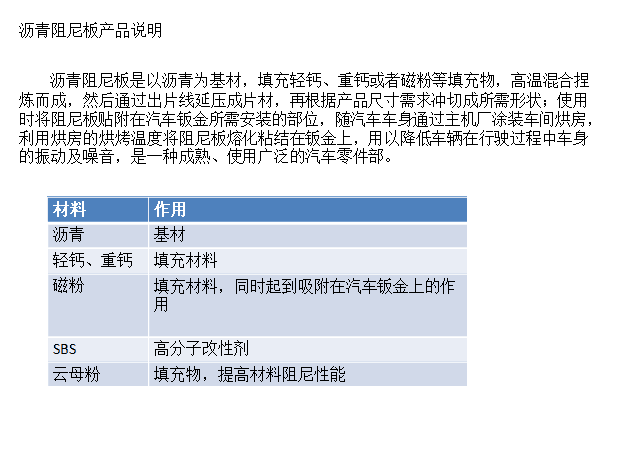 沥青阻尼板是以沥青为基材,填充轻钙、重钙或者磁粉等填充物,高温混合捏炼而成。然后通过出片线延压城片材,再根据产品尺寸需求冲切城所需形状;使用时将阻尼板贴附在汽车钣金梭需安装的部位,随汽车车身通过主机厂涂装车间烘房。利用烘房的烘烤温度将阻尼板熔化粘结在钣金上,用以降低车辆在行驶过程中车身的振动及噪音,是一种成熟、使用广泛的汽车零部件。